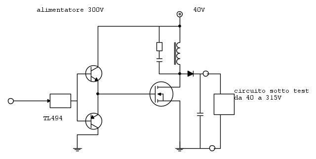 altro circuuito che ho realizzato da usare come alimentatore variabile da banco 300V, il mosfet è un 600V 3A, mi fornisce in uscita 60/70mA a 315V, tralascio il circuito di controllo, non fa altro che stabilizare la tensione al valore voluto e limitare la corrente massima. Ho ridotto la frequenza di lavoro da 65KHz a 32KHz, migliorando qualcosa in termini di riscaldamento del nucleo.