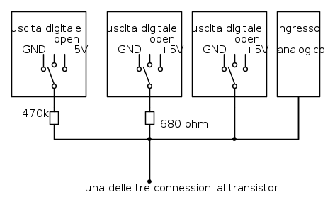 allego lo schema di principio di una delle tre connessioni al transistor.