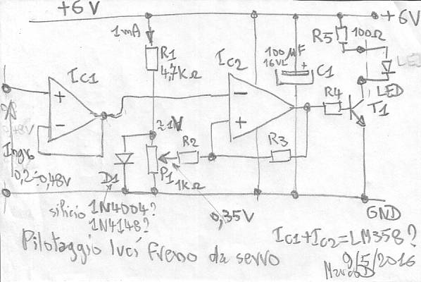 L'ho fatto un po' di fretta e potrebbero esserci errori, tieni presente che l'operazionale (il componente di forma triangolare) ha di solito 8 piedini e ne devono essere collegati almeno 5