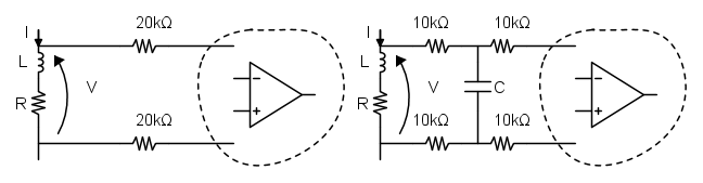 Il circuito effettivo e` un po' piu` complicato perche' c'e` un ingresso differenziale, con due resistenze e un operazionale dietro. In questo caso per avere delle capacita` piccole, non rovinare la stabilita` dell'amplificatore, si parte da questa situazione e si divide la resistenza a meta`, mettendo in mezzo il condensatore.