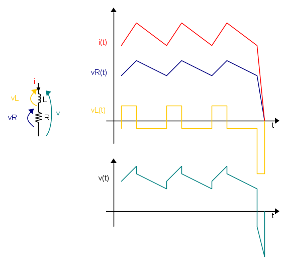 che e` un termine derivativo. Se la corrente sale linearmente leggo una tensione piu` alta di quella voluta, con un errore costante. Se c'e` un salto di corrente l'induttanza genera un picco di tensione molto alto, di valore pari a