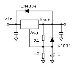 Se monti il condensatore devi anche aggiungere il diodo di protezione tra uscita e piedino di controllo (ADJ) altrimenti quando spegni si rompe l'integrato.