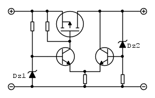 Per tensioni di ingresso di valore inferiore alla somma dei valori di tensione di conduzione dei due diodi zener il mosfet è in piena conduzione, quindi il circuito è trasparente, invece per tensioni di ingresso di valore superiore si chiude l'anello, il circuito va in linearità e la tensione di uscita si stabilizza al valore imposto dagli zener.