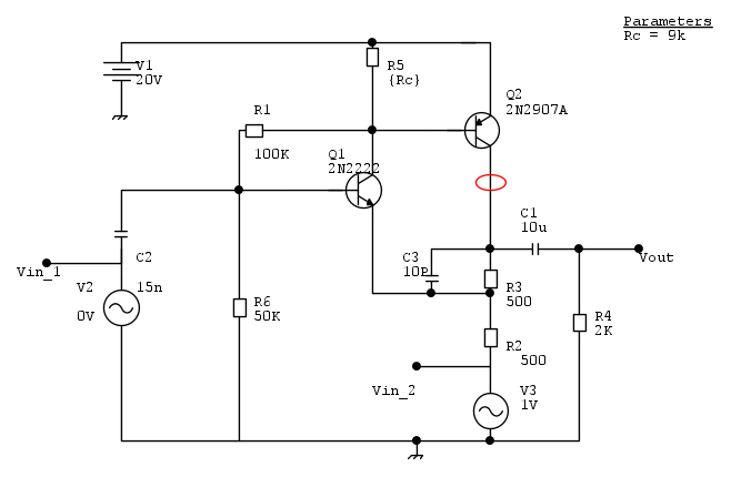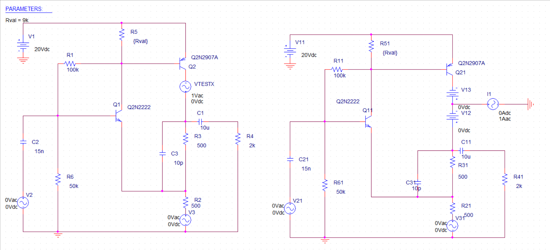 Inietti una tensione o una corrente e calcoli Ti e Tv. Consiglio di replicare due volte nel simulatore lo stesso circuito, nella stessa finestra, e simulare contemporaneamente i due casi in modo da avere insieme Tv e Ti.