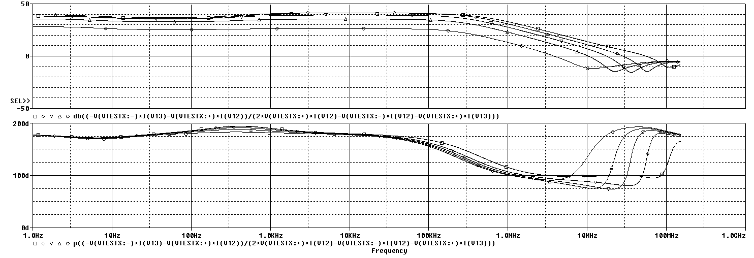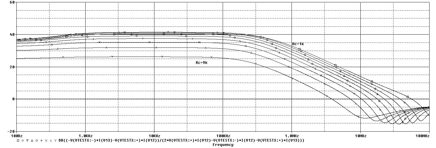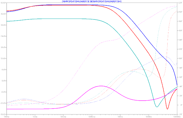 Si vede la curva viola, molto bassa che corrisponde a RC=10kohm. Il transistore T1 e` spento e non si puo` cavare sangue da una rapa o da un transistore spento. La curva verde dovrebbe essere con RC=7kohm, andiamo meglio. Riducendo ancora RC si hanno le curve rosse e blu, bisogna andare a vedere la frequenza di crossover e scegliere quale va meglio, avendo deciso se si vuole privilegiare ad esempio la banda o la stabilita`.