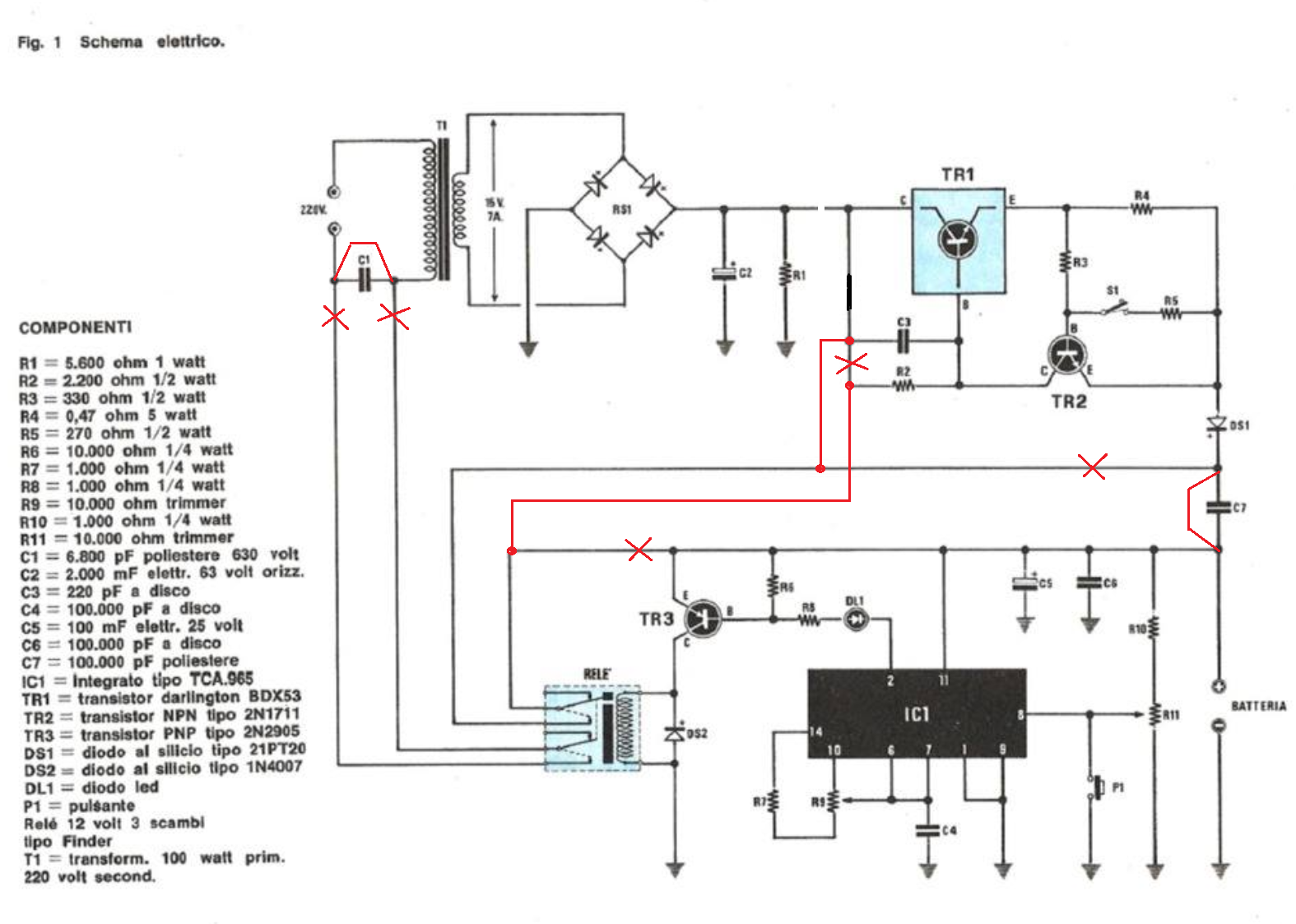 Da quando ho costruito ed utilizzato questo carica batterie, non ho mai fatto una riflessione critica sullo schema elettrico. Soltanto adesso, parlandone e ponderando i suggerimenti ricevuti mi sono reso conto che la commutazione in continua non ha nessuna ragione di esistere, ma proprio nessuna. Sembrerebbe (ma lo dico un po’ per scherzo) che Nuova Elettronica abbia acquistato una vagonata di relay a 3 scambi per i vari kit e, dovendo utilizzare tali relay anche per commutazioni di un solo scambio, deve aver ritenuto che utilizzando tutti gli scambi, anche dove non serviva, non sarebbe stato comunque dannoso.