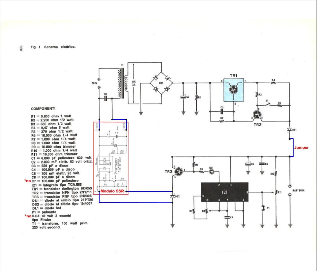 Proseguendo con i miei accertamenti, ho saputo che un mio conoscente mi regalerà, non sapendo cosa farne, un modulo SSR-D3808HK a 12V che commuta in alternata fino a 380 V. Ora, dopo aver compreso che la commutazione in continua è inutile, ho ritenuto più comodo e utile sostituire il relay Finder con il modulo SSR, che arriverà a breve, per interrompere soltanto l’alternata ed eliminare definitivamente, sostituendo il condensatore C7 con un jumper, la commutazione in continua. Tutto ciò grazie ai pareri e suggerimenti ricevuti.