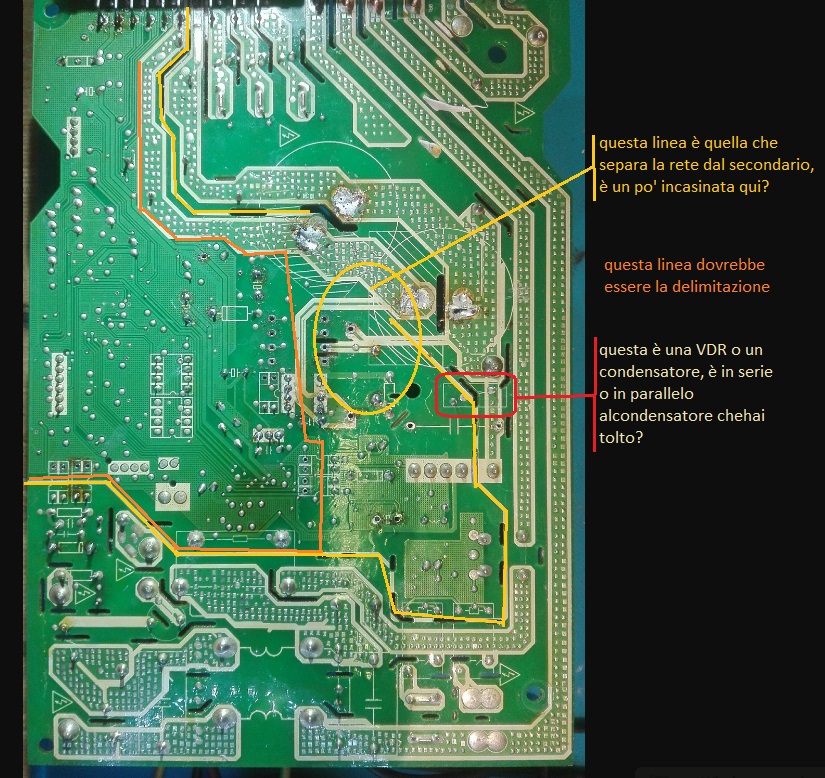 non ho trovato niente di interessante per la risoluzione e non voglio distoglierti troppo dal circuito, mi aveva incuriosito la tua richiesta e leggendoti mi ha proprio intrippato, certo che come ingegnerizzazione è incasinata bene bene, guardando la parte primaria che come dici te e @marioursino deve essere separata dal secondario, non sono riuscito a trovare il ponte di diodi e direi che è stato messo fuori dal PCB e va bene, nessun problema, ma seguendo la linea tratteggiata che dovrebbe delimitare la separazione , arrivo ad un punto che c'è un po' di caos, ti allego un'immagine con i miei dubbi, senz'altro l'avrai già spulciata e quindi non ti dico niente di nuovo ed è tutto regolare così.