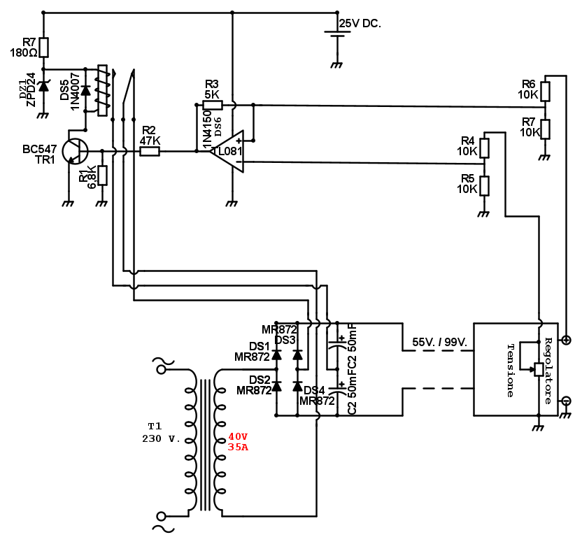 La tensione di 25V era di comodo, serviva giusto per indicare come avrei alimentato quella parte del circuito (se non fosse stato possibile alimentarla con una tensione già presente nell'alimentatore). Anche l’automatismo che ho pubblicato era (in questo contesto) uno schema di principio, non potendo funzionare con tensioni di 80V, ma ho auspicato che attraverso la discussione potesse scaturire un metodo per risolvere il problema. Ad ogni buon conto, recuperare in un modo o nell'altro pochi volt per alimentare un relè e un operazionale non sarebbe stato un grosso problema e non gli ho dato importanza.