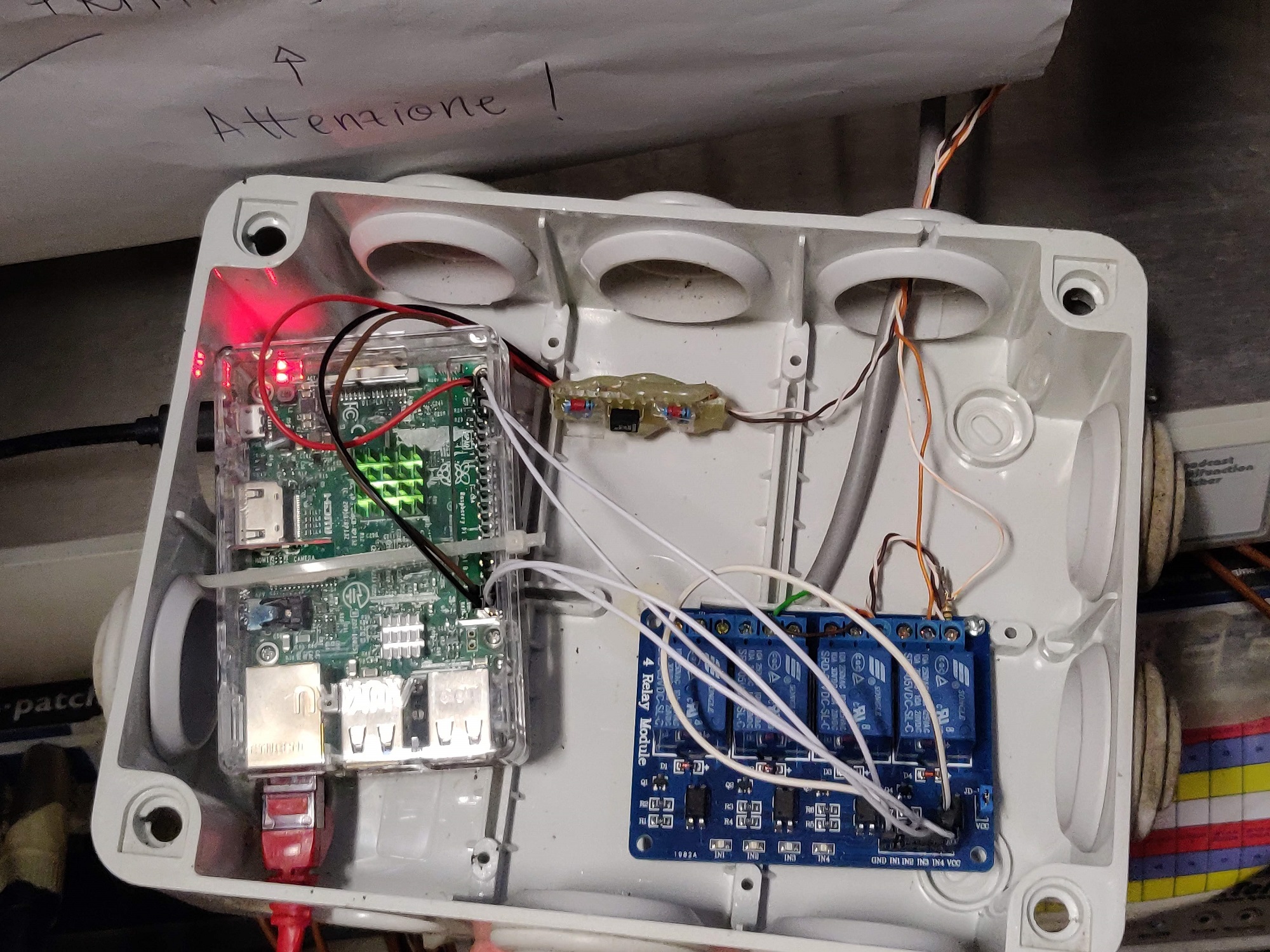 La scatola principale che contiene il raspberry, il modulo relè e il piccolo optoisolatore montato su una scheda millefori.