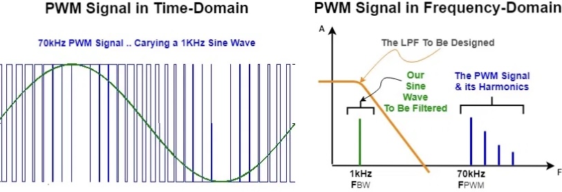Per l’onda triangolare il filtro è più complesso perché non hai un unico contributo armonico (la sinusoide) ma una banda, per cui diventa importante l’ondulazione in banda e la ampiezza di banda stessa. In ogni caso per l’onda triangolare non puoi evitare che la coda spettrale vada a finire sulla banda del PWM, per cui succederà che, anche se il tutto è ben progettato, avrai le armoniche più elevate della tua onda triangolare che finiranno in banda attenuata. Nel dominio del tempo questo di traduce ad avere gli “spigoli” superiore ed inferiore stondati, cosa che potrebbe non piacerti.