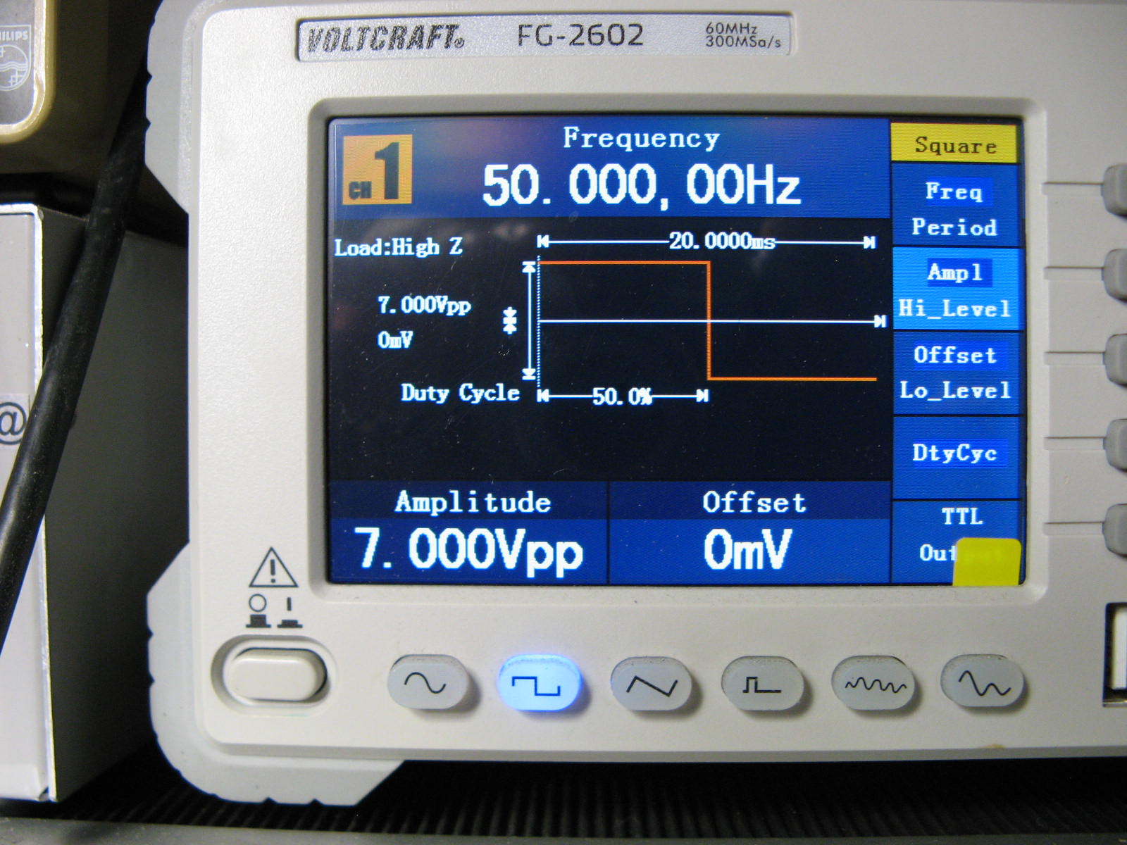 (foto 20) Gli ho applicato, su uno dei 2 avvolgimenti, un segnale ad onda quadra in questo caso di 7Vpp 50Hz. Questi parametri non sono critici e possono esere modificati per ottenere una forma d'onda simile a quella della successiva foto. L'unica accortezza è che la lunghezza del fronte positivo deve essere superiore al tempo che impiega l'induttanza a saturarsi, altrimenti non si riuscirebbe a fare le misurazioni successive.