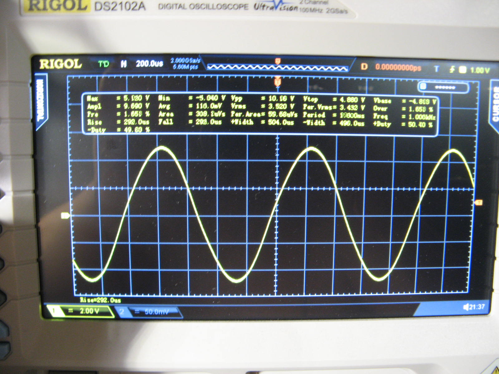 (foto 40) Se applico 3,5 Vrms a 1000Hz all'indutanza si vede una forma d'onda quasi perfetta. Non deltutto perfetta perché siamo comunque ai limiti della saturazione ed il generatore ha una resitenza interna di 50 ohm che non permette alla forma d'onda di far uscire una sinusoide perfetta.