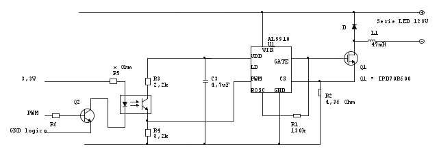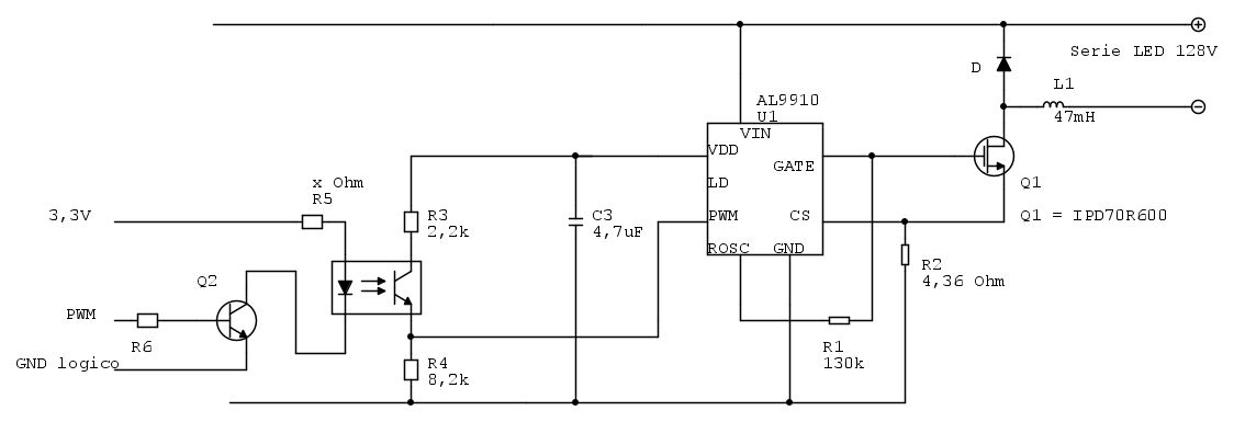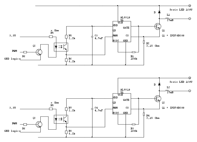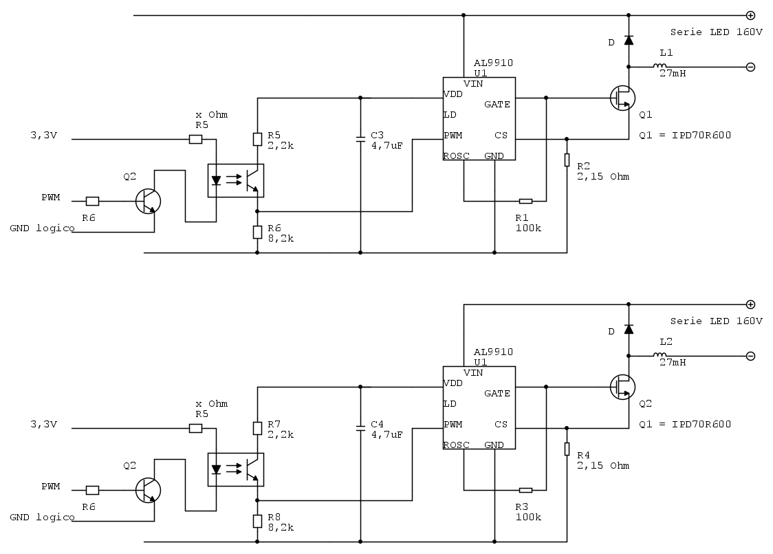 Visto che ne dovró installare 4 per via del numero di LED che ho da utilizzare (160 diodi), il segnale PWM mi conviene farlo per ogni driver (quindi 4 fotoaccoppiatori), oppure ne uso uno unico per tutti e 4 i driver? (anche se poi saranno due fotoaccoppiatori, perché necessito di pilotare i LED a gruppi di due per via della temperatura colore differente)