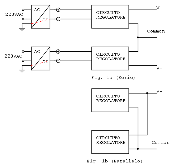 Questo ti consente di avere alta flessibilita' nei collegamenti - vedi Fig. 1a uscite in serie (tensione doppia) o Fig. 1b uscite in parallelo (corrente doppia).
