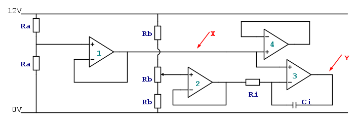 - e adesso finalmente il nostro integratore, costruito attorno a 3. Ri e Ci sono i componenti che determinano la caratteristica dell'integratore. Usa come condensatore un condensatore ceramico o a film, non un elettrolitico.
