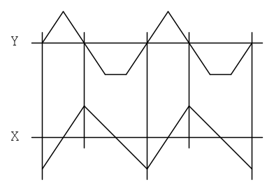 ...per ottenere il pentagono, se ho capito bene, hai applicato sugli assi X e Y due segali della stessa frequenza, quello sull'asse X di forma triangolare e quello sull'asse Y di forma triangolare con le punte basse tosate, con la fase in questo modo