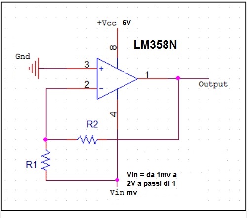 Fornendo in ingresso una tensione di 1 mv, mi sarei aspettato in uscita una tensione da 10 mv G=1+R2/R1 ed invece, arrivando via via a circa 18 mv, l'uscita va a 4.77 V considerando che sto alimentano il circuito con 6 volt.