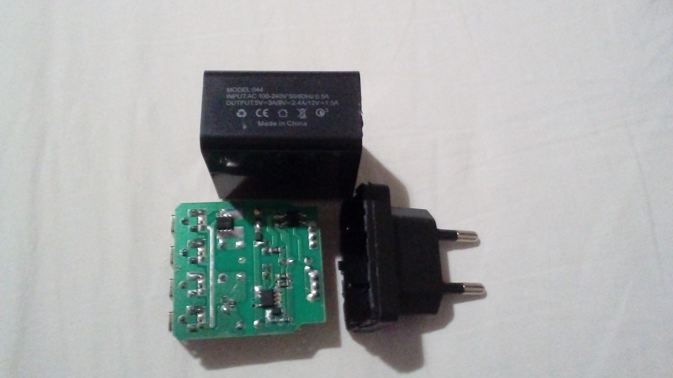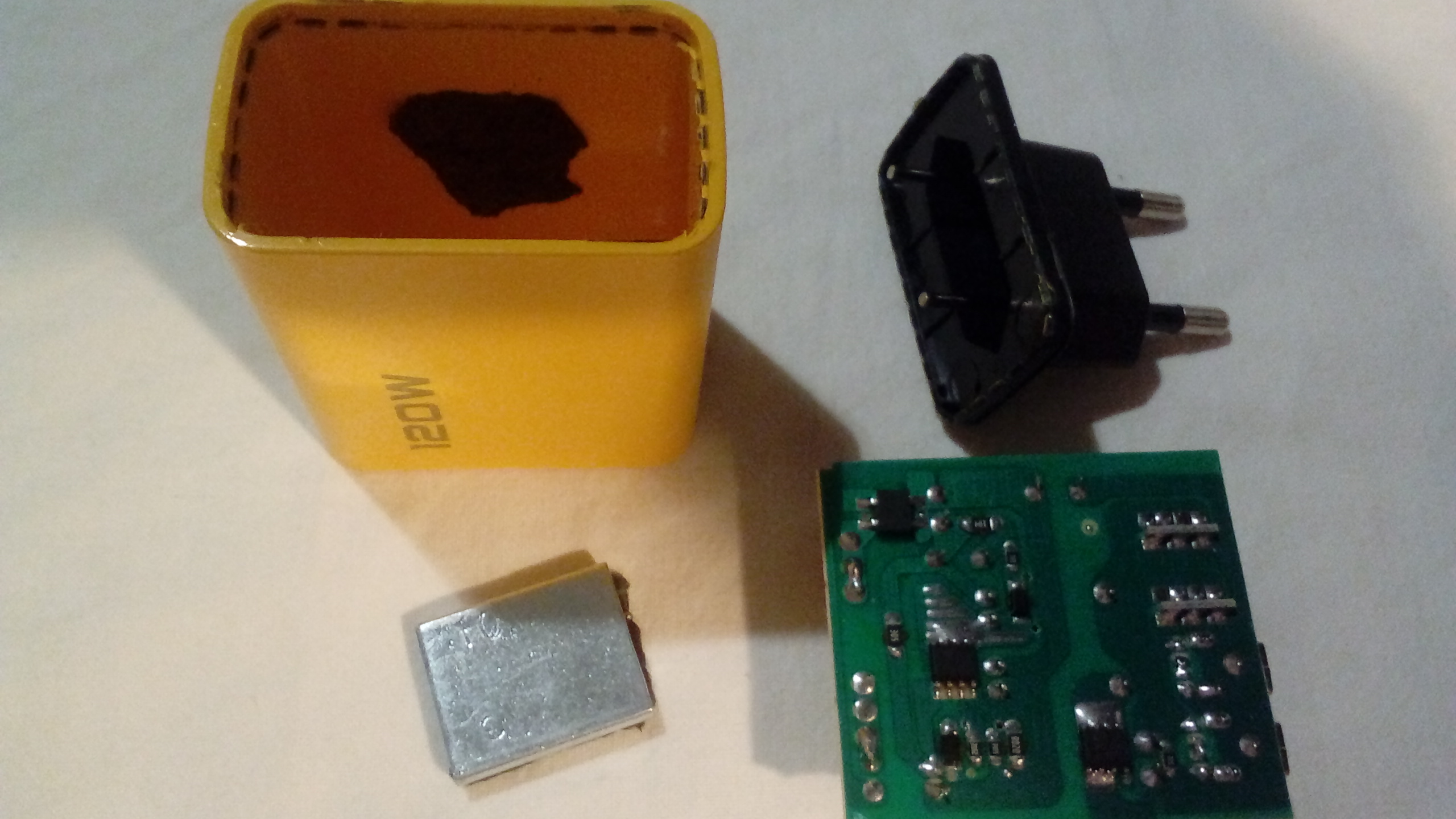 Modello uno, 65CW (china watt), dichiarato multiuscita (con carica rapida a 9 e 12 V), circuiteria da 10W (2A a 5V), nessuna carica rapida, nessun circuito di gestione, connettori USB3 e QC fasulli, un pezzo di stucco infilato dentro per fare peso.