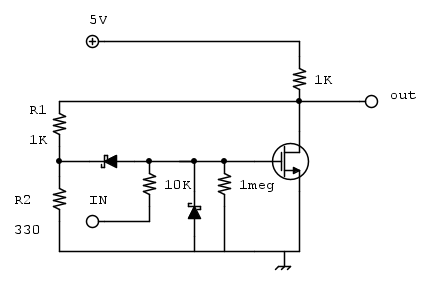 Lo scopo sarebbe di usare la bassa impedenza della retroazione per limitare in corrente l'ingresso. Il partitore R1-R2 è da tarare sull'ingresso del mosfet. Sarebbe credo piu efficace applicato al BJT, ma avrebbe anche meno senso.