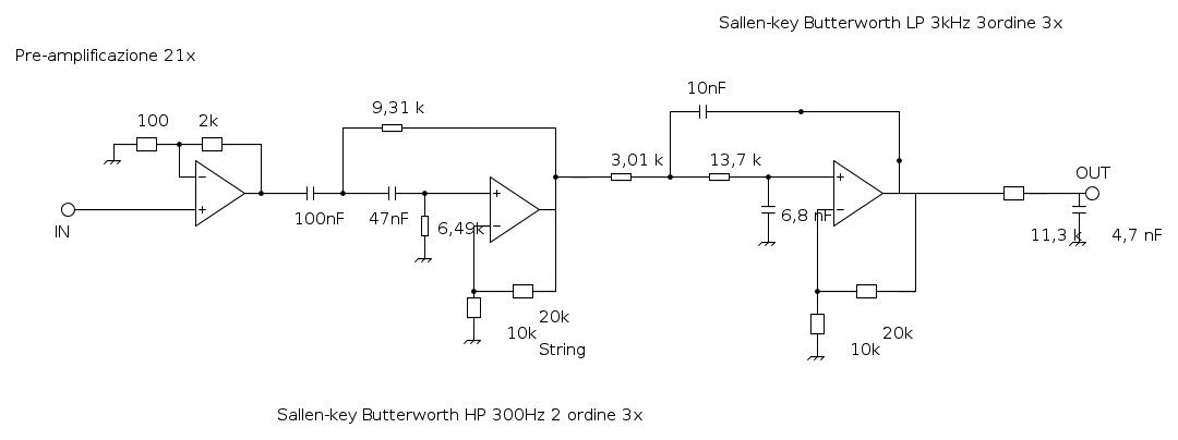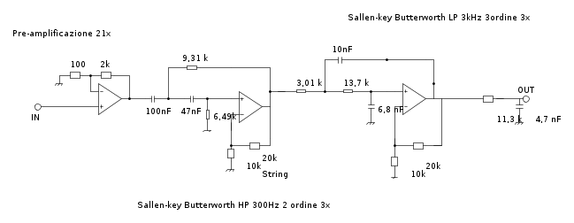 Per quanto riguarda il filtraggio del segnale ho scelto di utilizzare un passa alto del 2 ordine con taglio a 300 Hz, realizzato con topologia Sallen-key e di tipo Butterworth, seguito da un filtro passa basso del 3 ordine, dello stesso tipo e con in più un polo introdotto da circuito RC, con taglio a 3kHz. Non mi interessa una ulteriore selettività. Basta che la 50 Hz sia attenuata molto meno de segnale di interesse. Si dovrà pensare ad una frequenza di campionamento piuttosto elevata. La fase complessiva è risulta abbastanza lineare in banda passante. Entrambi i filtri guadagnano 3 (da suggerimenti ricevuti in questo forum non è bene far guadagnare oltre un Sallen-key), in modo che il guadagno totale sia 21*3*3, cioè circa 190.