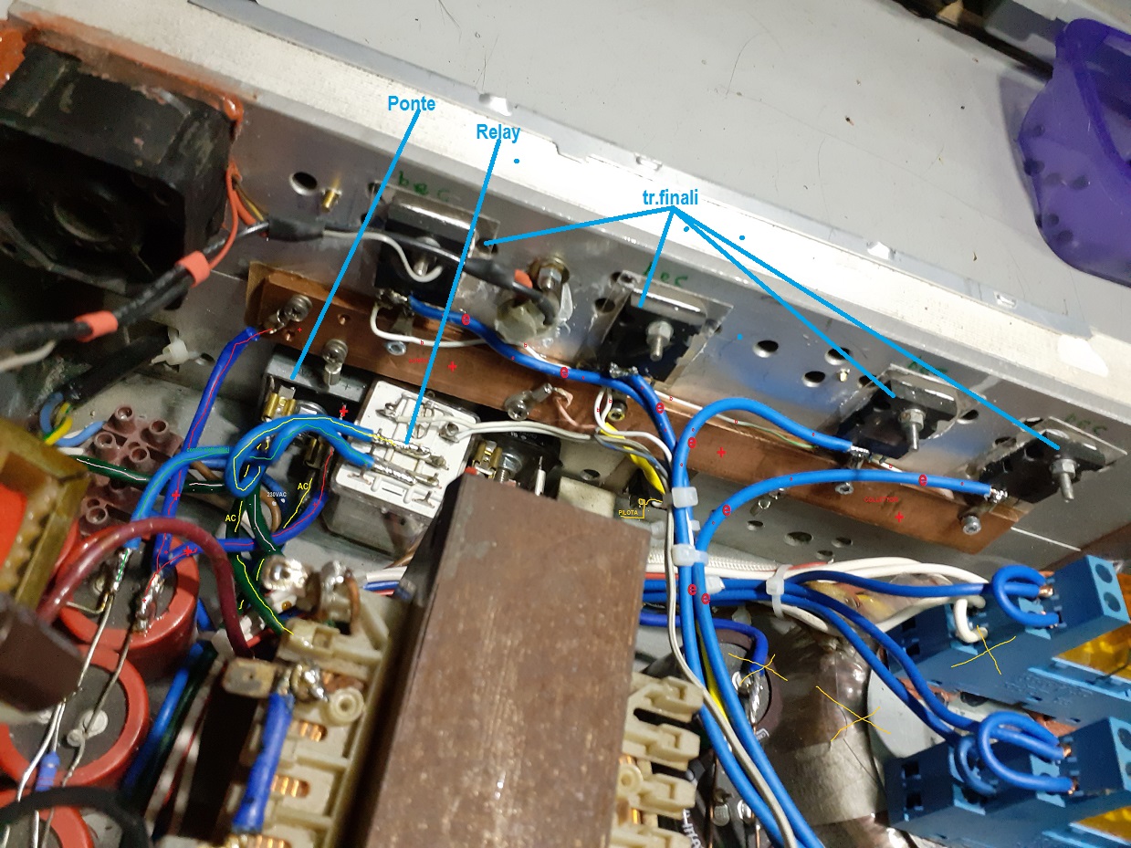 Questo nuovo cablaggio mi ha permesso di avere dei collegamenti molto corti per quanto riguarda la corrente ed anche per i collegamenti della PCB di controllo, ho collegato il darlington driver con cavetti schermati ed eliminato il collegamento di collettore in quanto disposto direttamente sulla barra in rame, di alimentazione dei transistor finali, sempre 4 .