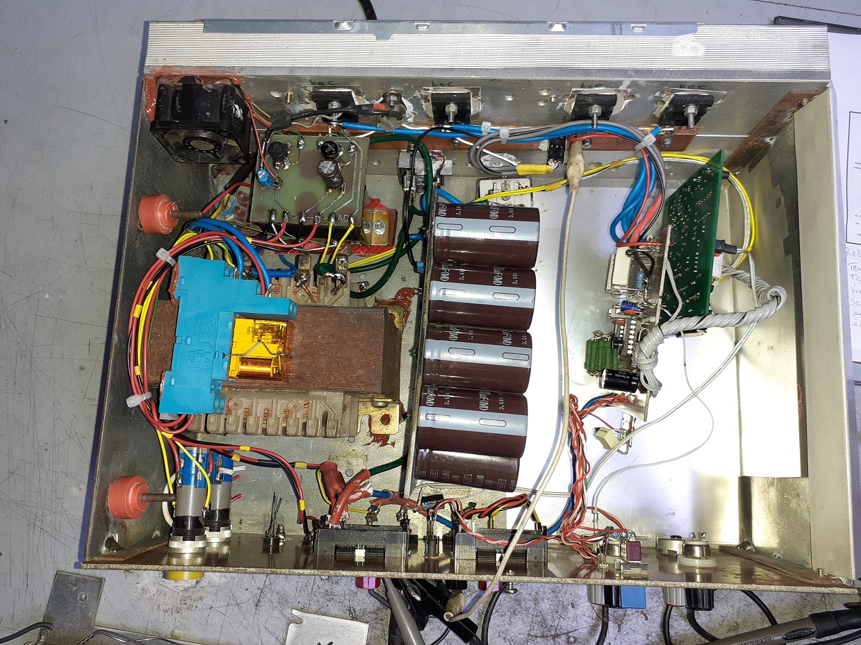 Dopo aver considerato che l'alimentatore autooscillava e probabilmente a causa di un cablaggio poco idoneo, ho deciso di ricablarlo di sana pianta, ho tolto un trasformatore che avevo messo per un'idea iniziale, ma che non serviva più ed ho sistemato diversamente i vari gruppi; ho raggruppato su un lato i vari trasformatori, 1 di potenza e due di servizi, in modo da avere un cablaggio della AC che non passasse assieme alla DC e schede di controllo; ho messo un banco di condensatori elettrolitici nuovo, 16 Condensatori da 4700 uF 80V e cioè 8 cond. + 8 messi in serie per avere la presa centyrale per il duplicatore, per un totale di 18.800 uF come filtro sulla AC.