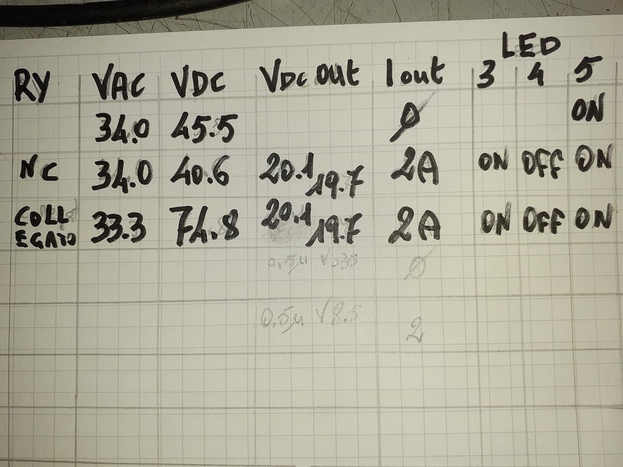 Tester sull'uscita = 20,25V a vuoto e 20,25V con 2A di carico.