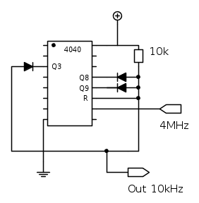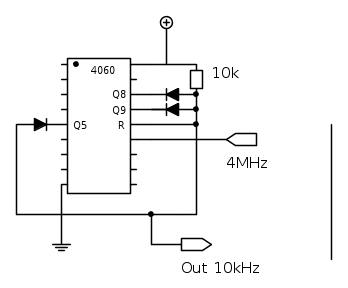 A parte questo secondo me il tuo schema è corretto. In uscita dovresti ottenere i 10kHz. Il fatto che sul Q9, che è il pin tra quelli selezionati ad avere il periodo più lungo, tu legga una frequenza prossima a quella cercata vuol dire che ci sei, Il contatore si resetta ogni 100.5 µs e quindi la frequenza d' uscita è di 9950Hz. L' errore rispetto ai 10kHz calcolati è dello 0,5% e credo sia dovuto al tempo impiegato dal pin di reset per salire fino alla soglia del livello logico alto, quindi ci potrebbe stare.