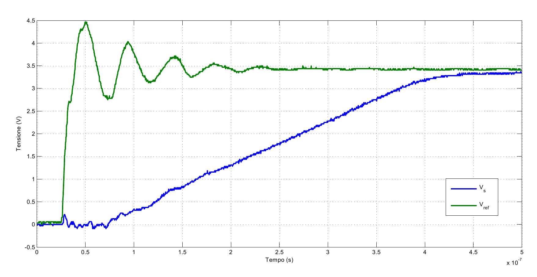 tramite matlab avevo stimato un tempo di salita dell'ordine dei 200ns, dalla misura conto circa 300ns.