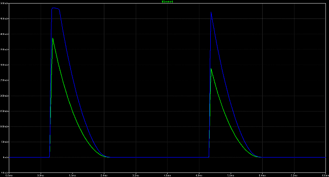 Questi sono i primi due cicli simulati con il circuito del messaggio [86]. Curva blu e` il transistore "originale", curva verde transistore con beta di 100.