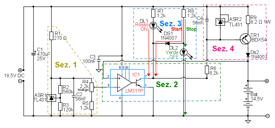 Come funziona? Provo a dare una spiegazione dividendo il circuito in 4 sezioni.