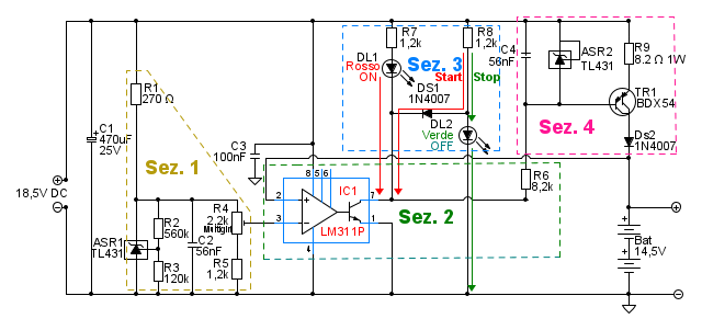 Il led verde durante la carica risulterà spento e non riceverà alimentazione essendo questa deviata e cortocircuitata al GND dal diodo DS1 e i pin 7/1 di IC1. Ricaricata la batteria, il comparatore interromperà la conduzione tra la giunzione del BJT di cui ai pin 7/1 di IC1 e il GND, il LED verde riceverà la piena alimentazione dalla resistenza R8 e, accendendosi, indicherà il completamento della carica. Il comparatore andrà in standby, TR1 non sarà più pilotato, il LED rosso risulterà spento e la batteria non sarà più in carica.