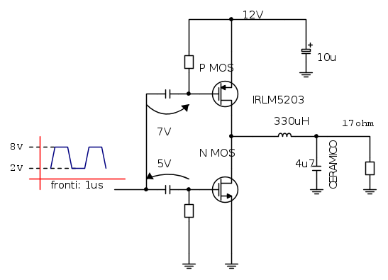 mi serve una corrente per caricare la Cgs con picchi di circa 12/100 ohm=120mA.
