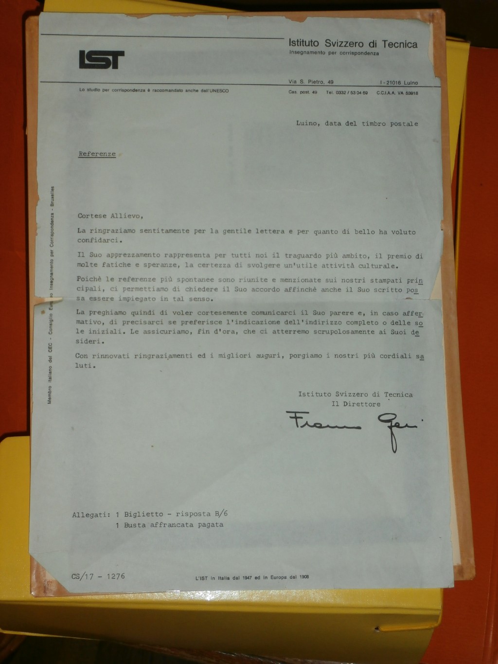 alla fine mi ero affezionato al mio "prof a distanza", mi dispiaceva che il corso era finito. Scrissi una lettera di ringraziamento, evidentemente a 18 anni ero meno antipatico di adesso ed ecco cosa mi risposero: