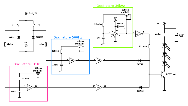 Guardando lo schema considera che quando premi P1 blocchi l'oscillatore a 1kHz e quindi il trasmettitore genererà la portante a 36kHz modulata a 500Hz, mentre quando premi P2 blocchi l'oscillatore a 500Hz quindi verrà sempre generata la portante a 36kHz ma modulata a 1kHz.