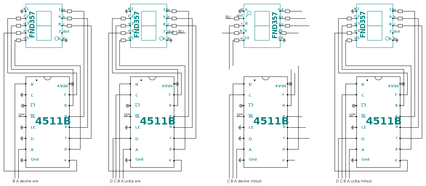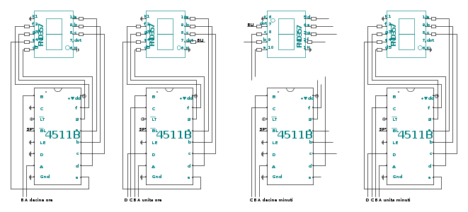 La cosa importante e` che ogni uscita dei 4511 con nome a,b,c,d,e,f,g deve essere collegata con una resistenza al corrispondente segmento dei display. Il valore della resistenza dipende dal display e da quanta luce vuoi avere. Anche questi display saranno attenuati di notte e spenti se manca energia elettrica.