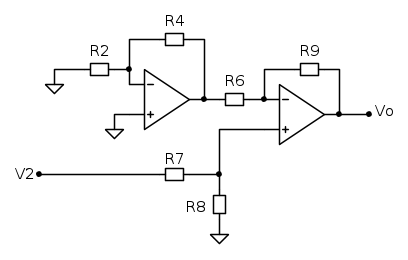 V_o^{\prime \prime}=-\frac{R_9}{R_6}\left( 1+\frac{R_4}{R_2} \right)V_2