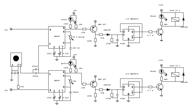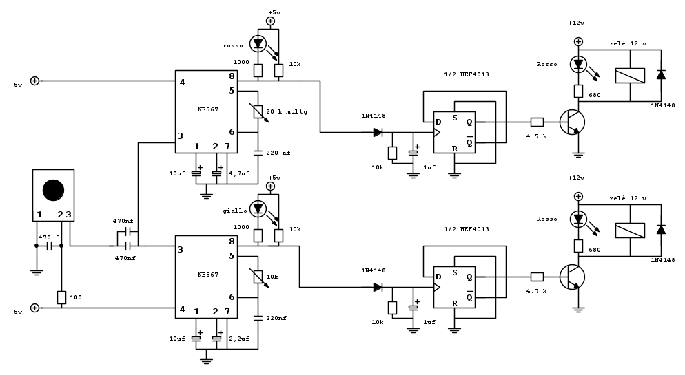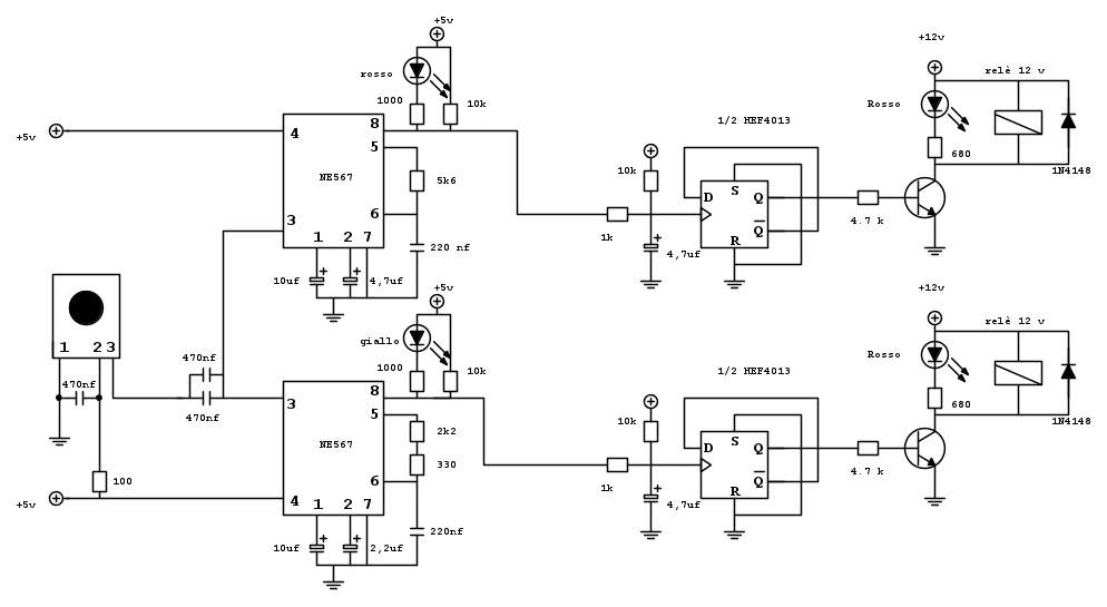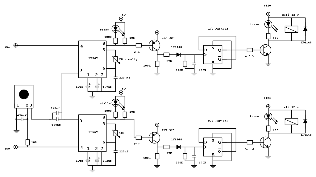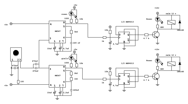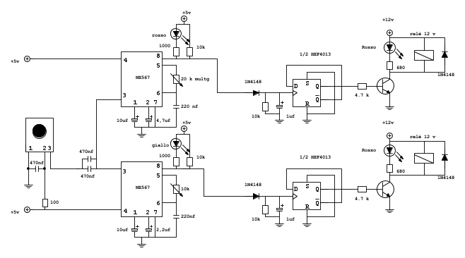 Per il ricevitore sarebbe opportuno modificare la parte tra il 567 e il 4013. Devi aggiungere un diodo in modo che la carica del condensatore da 4,7µF avvenga attraverso la resistenza da 10k: