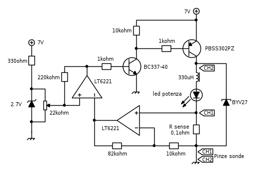 Come si può vedere la corrente di picco nel ramo di potenza è stata regolata a 1,4A mentre la frequenza di switching è di circa 50kHz. L' induttore ha un valore leggermente differente, è da 330µH invece che da 350µH e l' amplificazione del primo operazionale è di circa 9 volte. Per il momento ho evitato di aggiungere altri oscillogrammi ma se dovessero interessare non esitate a chiedere.