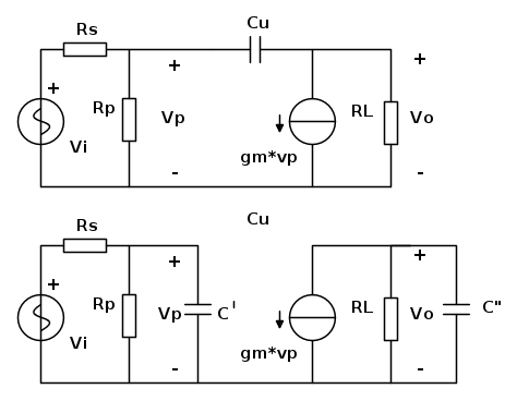 Ad esempio se prendi il circuito originale senza Cp, hai un solo condensatore (Cu) e quindi un solo polo. Se lo milleri usando guadagno -gm RL, trascurando cioe` l'effetto di carico di Z", nella funzione finale vengono due poli che mi sembrano troppi :)