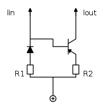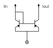 Se i due transistori sono identici, stessa temperatura, la corrente di uscita Iout e quella di ingresso Iin sono circa uguali perche' sono uguali le VBE. Se i transistori hanno un'area diversa di un fattore k, ceteris paribus, la corrente di uscita sara` variata di un fattore k. Per fare fattori di specchiaggio molto minori di uno, senza dover usare aree di silicio molto grandi, si usa questo circuito, inventato da Widlar:
