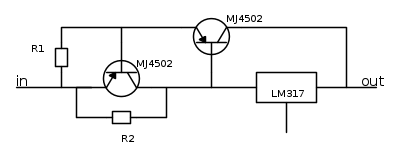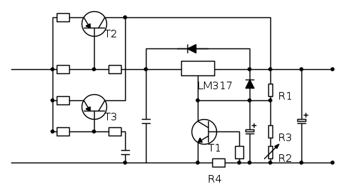 In un messaggio di tre mesi fa circa mi sembra che avessi fatto un "accrokware" a transistori per aggiungere una limitazione di corrente (ahime` di prestazioni abbastanza scadenti) a un circuito analogo. Non so se possa essere adattato a questo caso, qui la corrente e` parecchio piu` alta.