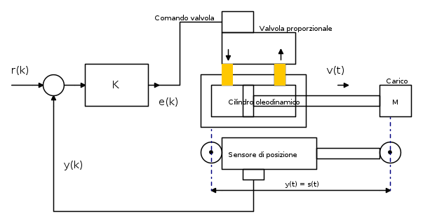 della valvola è costante ) per cui la posizione del cilindro stesso è l'integrale della velocità. Misurando la posizione con un sensore si ha quindi un sistema che risponde ad una costante in ingresso ( segnale alla valvola ) con un certo integrale in uscita ( posizione del carico