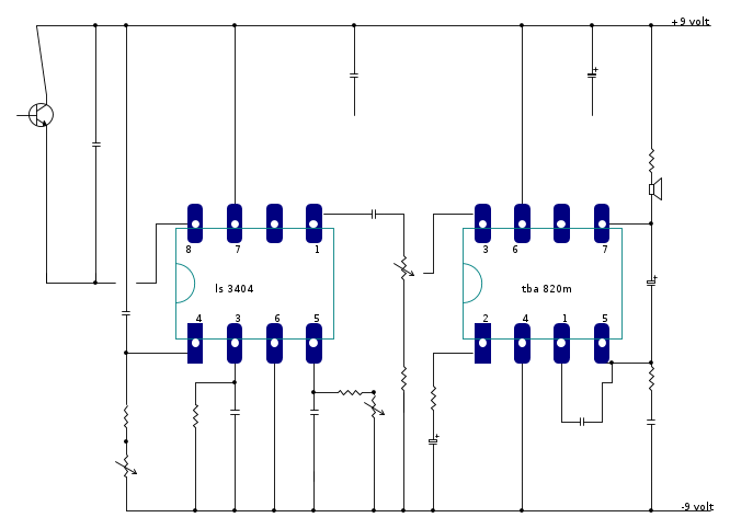 Il tba820m non toglierlo assolutamente! Il NE555 lo inserisci a parte, il pulsante lo sostituirai col transistor.