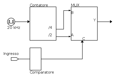 . Quindi potrai prelevare sia un segnale con frequenza divisa 2 (10 kHz) che un segnale a frequenza divisa 4 (5 kHz). Quale segnale prendere lo deciti tramite un multiplexer comandato dal segnale del comparatore in ingresso. Un esempio di contatore è il HD74HC668, oppure il CD4060 (anche se non ti servono 12 bit in uscita, in realtà te ne basterebbero due).