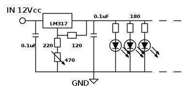 [pilotando la corrente nei LED da circa 5 a 20mA, quindi al massimo il potenziometro dovra' sopportare 100mA]