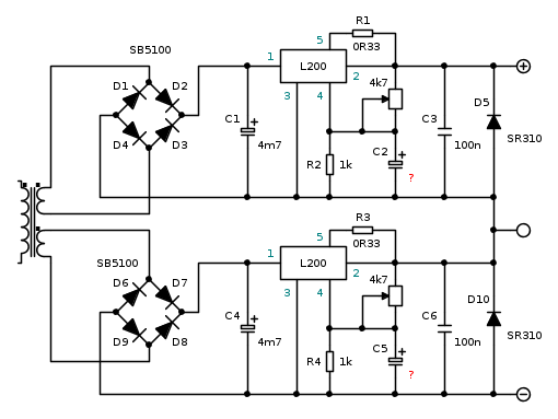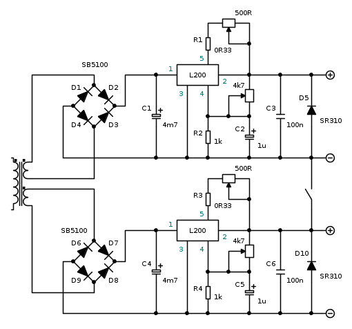 così si hanno due alimentatori conpletamente indipendenti con la possibilità di alimentare contemporaneamente due circuiti diversi (o un circuito che necessiti di due tensioni diverse) oppure circuiti che necessitino di alimentazione simmetrica