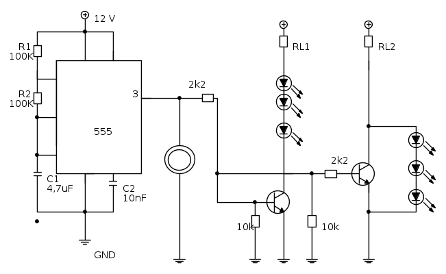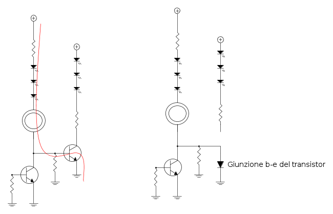Alberto ) questa piccola corrente attraversa i led di sinistra ( se per esempio la corrente di base fosse 1 mA, i led faranno una piccola luce, che se è giorno non si vedrà, ma se l' ambiente è scuro si vedrà qualcosa )