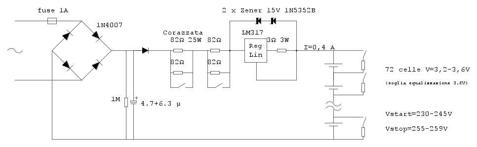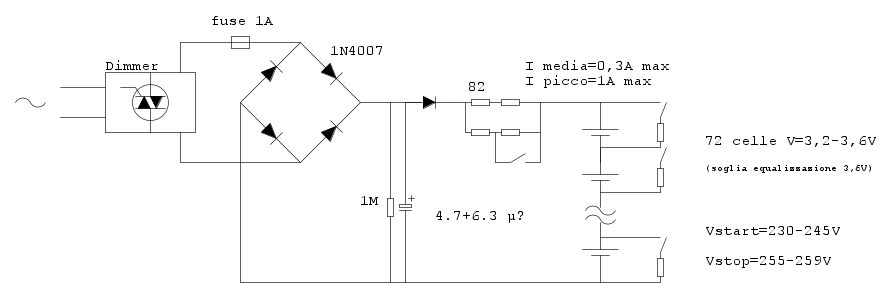 Con tensione in ingresso di 325Vpp, se voglio limitare la corrente di picco a circa 1A ricavo nel caso peggiore (Vbatt=230) R=95Ohm.
